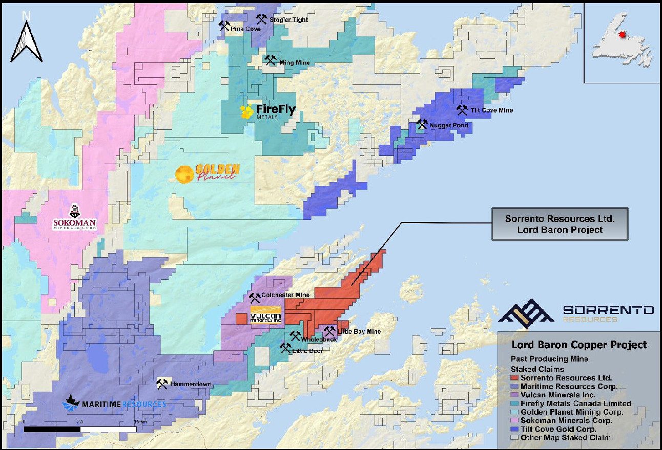 Alex Bugden, P. Geo., Director and Qualified Person of Sorrento Resources Ltd., commented, “This is a transformational acquisition for Sorrento Resources. Since the start of 2024, we worked diligently to consolidate the Lord Baron Project. To see it completed is an exciting milestone for the company. With this acquisition, Sorrento Resources, Firefly Metals, and Vulcan Minerals are now the dominant players in control of the historic mining district which is the Springdale Peninsula.”