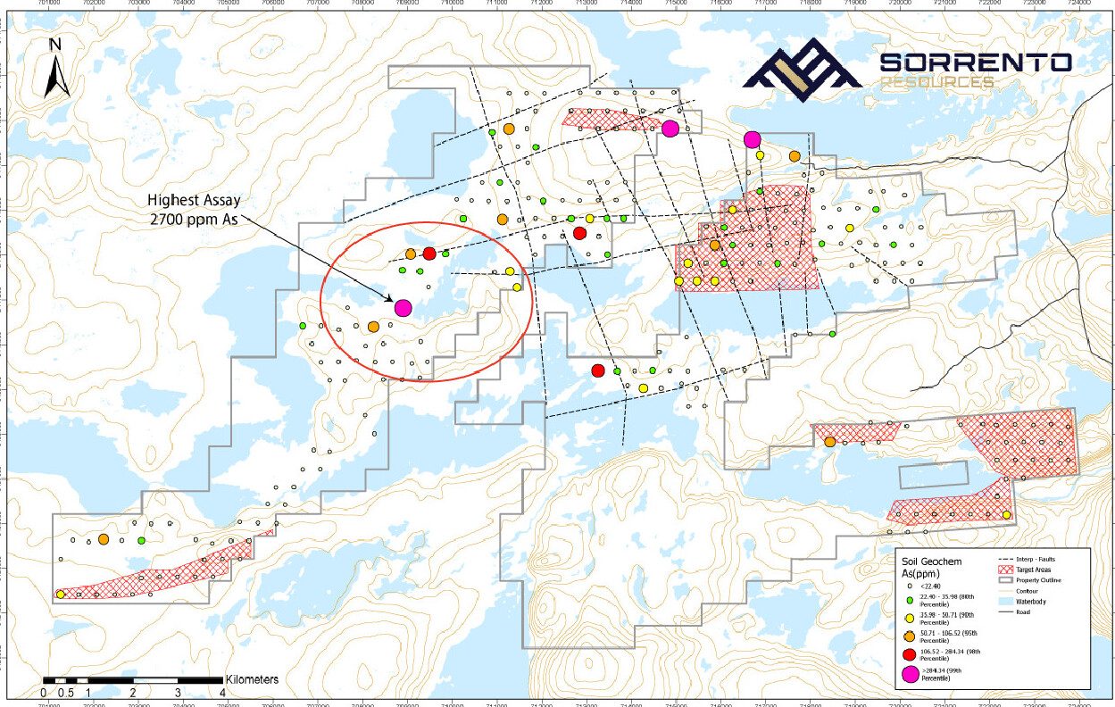 PDF UnavailableVANCOUVER, BRITISH COLUMBIA, January 18th, 2024–SORRENTO RESOURCES LTD. (the “Company”) (CSE: “SRS”, OCTQB: “SRSLF”) is pleased to announce that it has received analytical results from the fall geochemical sampling program carried out at the Wing Pond Property. In total 274 soil samples were collected across the Property in an approximate 400m x 400m spaced grid. In addition, 27 grab samples were collected over the course of the program.