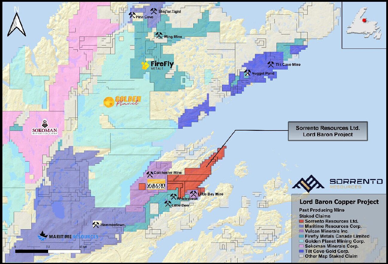 Alex Bugden, P. Geo., Director and Qualified Person of Sorrento Resources Ltd., commented, “This is a transformational acquisition for Sorrento Resources. Since the start of 2024, we worked diligently to consolidate the Lord Baron Project. To see it completed is an exciting milestone for the company. With this acquisition, Sorrento Resources, Firefly Metals, and Vulcan Minerals are now the dominant players in control of the historic mining district which is the Springdale Peninsula.”